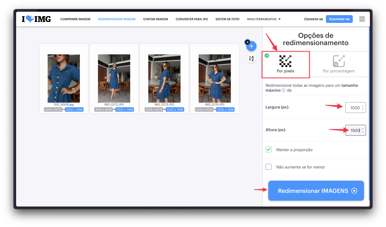 4. Na seção "Opções de Redimensionamento", defina a largura e a altura desejada para a imagem. (Recomendamos o redimensionamento por Pixels com a proporção de 1000 (Largura) x 1500 (Altura).)